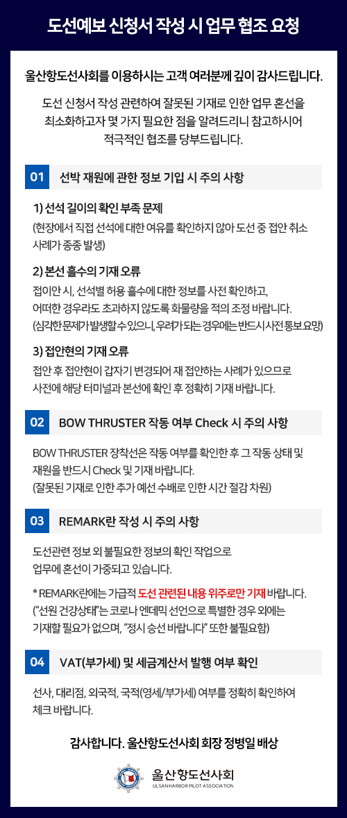 | 9 | Port conditions surcharge | 1. No.1 P/S <-> Ulsan : 35% of basic pilotage (All vessels are greater than 10,000GT) |